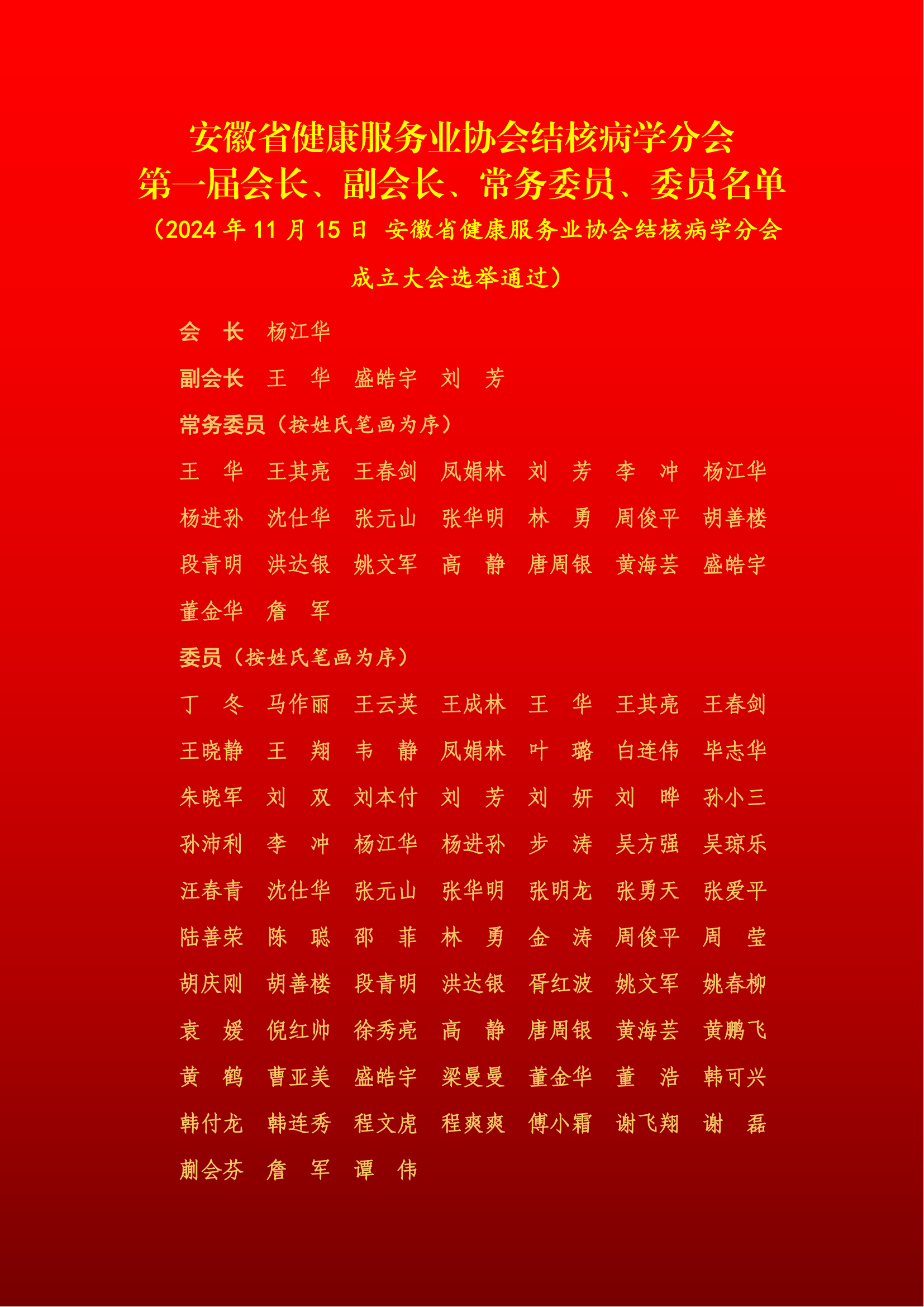 △安徽省健康服務(wù)業(yè)協(xié)會結(jié)核病學分會成立大會合影△安徽省健康服務(wù)業(yè)協(xié)會結(jié)核病學分會第一屆會長、副會長、常務(wù)委員、委員名單 |