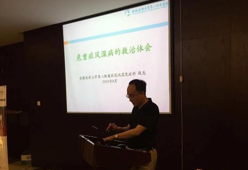 然后安徽醫(yī)科大學(xué)第二附屬醫(yī)院風(fēng)濕免疫科錢龍教授對風(fēng)濕病危重患者的救治談了自己的體會。風(fēng)濕免疫危重癥的范疇包括:系統(tǒng)性紅斑狼瘡:腦病、彌漫性肺泡出血、狼瘡腎病;皮肌炎、多肌炎快速進(jìn)展間質(zhì)性肺炎;硬皮病危險等。通過兩個典型的病例1、初診醫(yī)生沒有意識到類風(fēng)濕角膜潰瘍的后果2 對類風(fēng)濕關(guān)節(jié)炎眼累及缺乏的分析,談到:低血容量休克病人無尿----補(bǔ)液擴(kuò)容;硬皮病腎危險、腎功能不全、ACEI使用的問題。最后總結(jié):兩害相權(quán)取其輕,不要再矛盾的兩種問題上糾結(jié)糾纏,善于抓主要矛盾,突破自身既往認(rèn)識—認(rèn)準(zhǔn)的事情要堅定信念,排除內(nèi)心的干擾。獲得了參會醫(yī)生的陣陣掌聲。