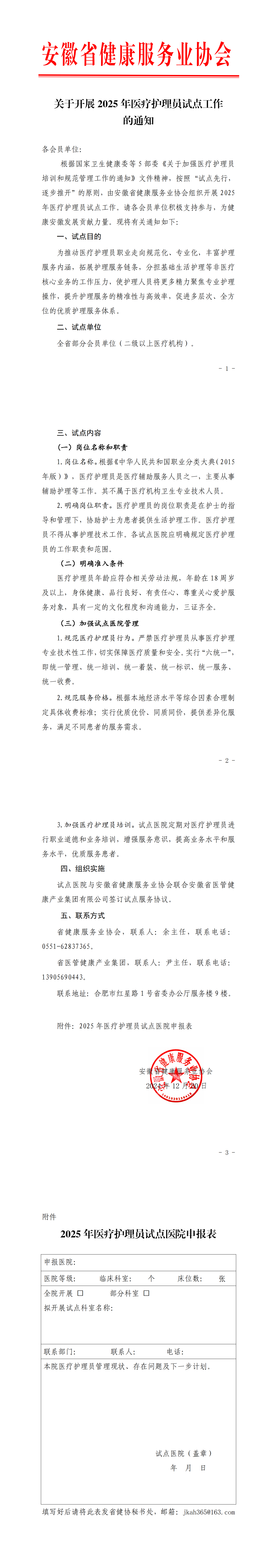 根據(jù)國(guó)家衛(wèi)生健康委等 5 部委《關(guān)于加強(qiáng)醫(yī)療護(hù)理員培訓(xùn)和規(guī)范管理工作的通知》文件精神,按照“試點(diǎn)先行,逐步推開”的原則,由安徽省健康服務(wù)業(yè)協(xié)會(huì)組織開展 2025年醫(yī)療護(hù)理員試點(diǎn)工作。請(qǐng)各會(huì)員單位積極支持參與,為健康安徽發(fā)展貢獻(xiàn)力量,F(xiàn)將有關(guān)通知如下: