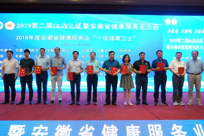 2018年安徽省健康服務(wù)業(yè)“十佳”單位及個人。獲得“十佳創(chuàng)新單位”分別為:中國科學(xué)技術(shù)大學(xué)附屬第一醫(yī)院南區(qū)、皖南醫(yī)學(xué)院弋磯山醫(yī)院、安徽省兒童醫(yī)院、阜陽市人民醫(yī)院、六安市人民醫(yī)院、滁州市第一人民醫(yī)院、蚌埠市第三人民醫(yī)院、安徽省皖南康復(fù)醫(yī)院、阜陽市第五人民醫(yī)院、壽縣中醫(yī)醫(yī)院。獲得“十佳創(chuàng)新人物”分別為:安徽華源醫(yī)藥股份有限公司王軍、霍邱縣第二人民醫(yī)院朱文章、利辛縣中醫(yī)院劉勇、皖南醫(yī)學(xué)院附屬第二附屬醫(yī)院劉冰瑩、安徽醫(yī)科大學(xué)第一附屬醫(yī)院孫國平、阜陽市婦女兒童醫(yī)院李忠民、安徽海豚健康管理有限公司胡興龍、蚌埠醫(yī)學(xué)院第一附屬醫(yī)院魯正、懷遠縣人民醫(yī)院褚永光、太和縣中醫(yī)院顏鵬飛。獲得 “十佳健康衛(wèi)士”分別為:合肥金域醫(yī)學(xué)檢驗實驗室有限公司申夢來、安徽省第二人民醫(yī)院吳昭芹、蕪湖市第二人民醫(yī)院張靜、合肥市第四人民醫(yī)院張許來、廬江縣中醫(yī)院陳明、臨泉縣中醫(yī)院鄭漢軍、阜陽市第二人民醫(yī)院韓明鋒、滁州市中西醫(yī)結(jié)合醫(yī)院童宗培、安徽濟民腫瘤醫(yī)院滿祎、中國科學(xué)技術(shù)大學(xué)附屬第一醫(yī)院褚俊。