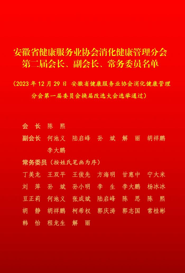 △安徽省健康服務(wù)業(yè)協(xié)會(huì)消化健康管理分會(huì)第二屆會(huì)長、副會(huì)長、常務(wù)委員名單