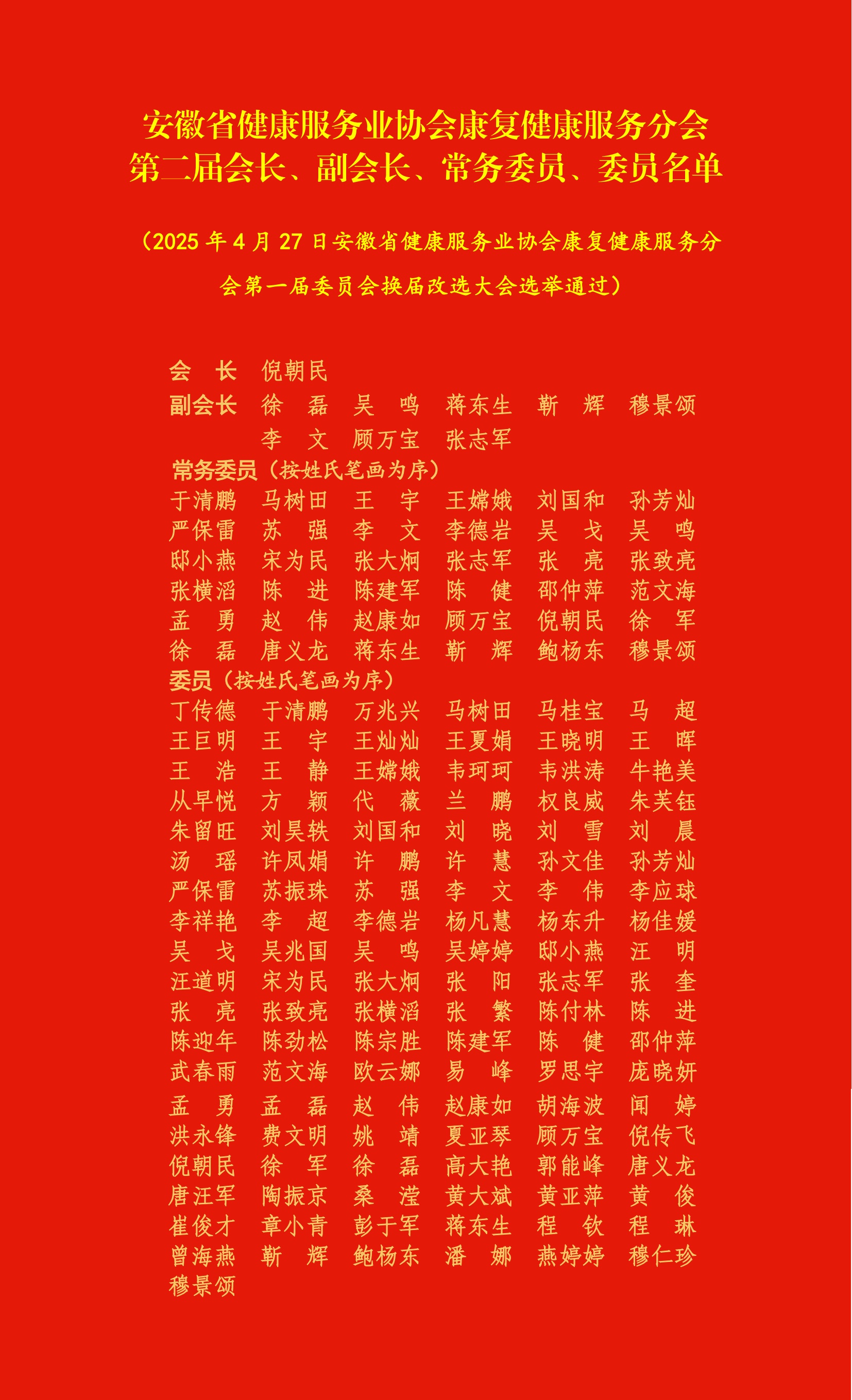△安徽省健康服務業(yè)協(xié)會康復健康服務分會第二屆會長、副會長、常務委員、委員名單
