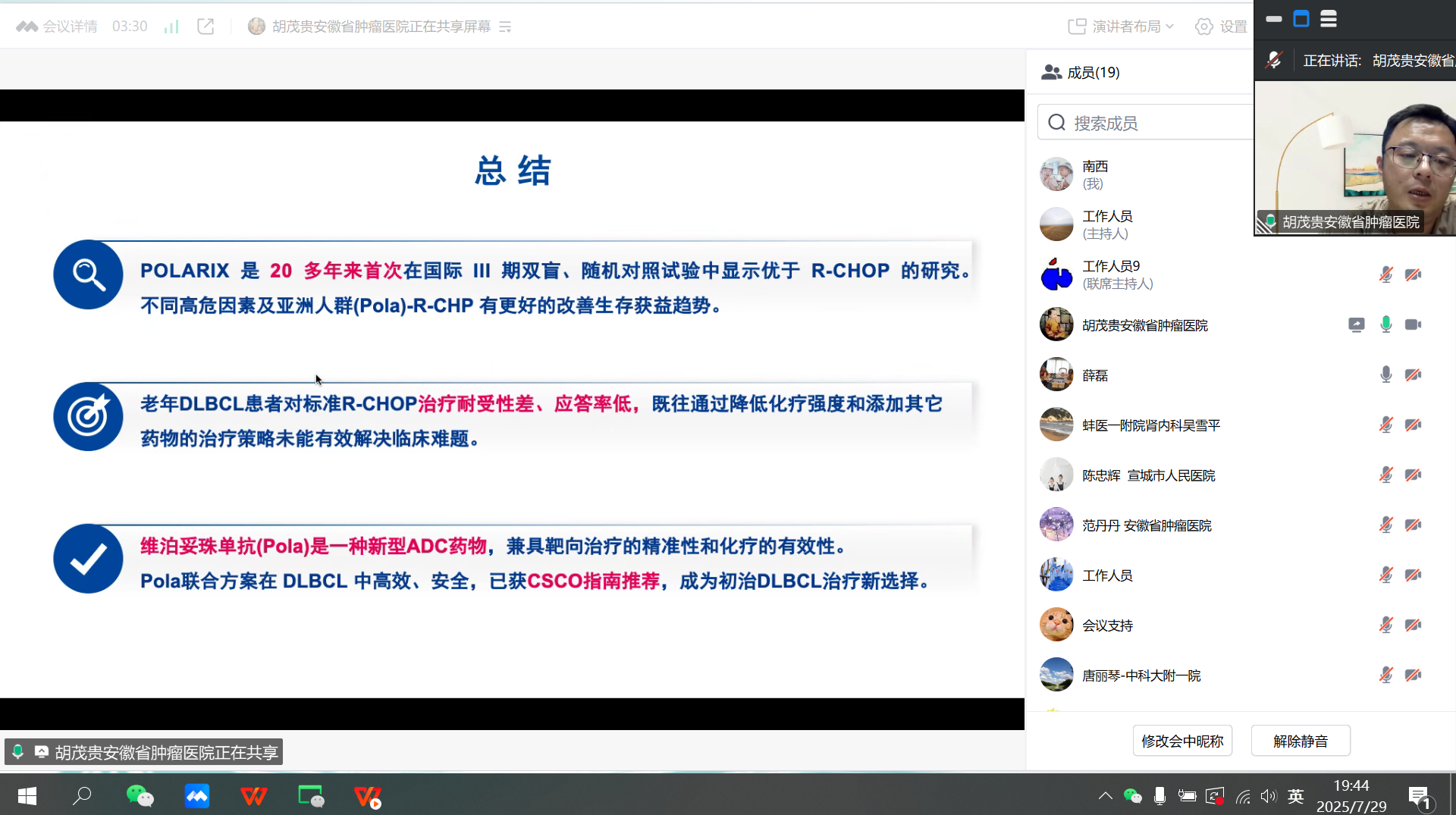2025年7月29日,由安徽省健康服務(wù)業(yè)協(xié)會(huì)主辦的淋巴瘤多學(xué)科創(chuàng)新與發(fā)展學(xué)術(shù)交流會(huì)通過(guò)線上平臺(tái)成功召開。本次會(huì)議匯聚了中國(guó)科學(xué)技術(shù)大學(xué)附屬第一醫(yī)院、安徽省腫瘤醫(yī)院、安徽醫(yī)科大學(xué)第一附屬醫(yī)院、江蘇省腫瘤醫(yī)院、宣城市人民醫(yī)院、蚌埠醫(yī)科大學(xué)第一附屬醫(yī)院等省內(nèi)外30余家醫(yī)療機(jī)構(gòu)的200余位血液領(lǐng)域?qū)<覍W(xué)者,圍繞淋巴瘤診療的新進(jìn)展、新技術(shù)及多學(xué)科協(xié)作等議題展開深入探討,為推動(dòng)我省淋巴瘤診療水平提升搭建了高質(zhì)量的學(xué)術(shù)交流平臺(tái)。