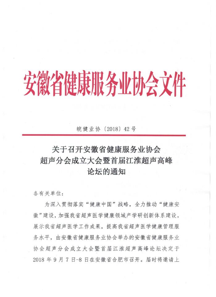 為深入貫徹落實(shí)“健康中國(guó)”戰(zhàn)略,全力推動(dòng)“健康安徽”建設(shè),加強(qiáng)我省超聲醫(yī)學(xué)健康領(lǐng)域產(chǎn)學(xué)研創(chuàng)新體系建設(shè),展示我省超聲醫(yī)學(xué)工作成果,提高我省超聲醫(yī)學(xué)健康管理服務(wù)水平,由安徽省健康服務(wù)業(yè)協(xié)會(huì)舉辦的安徽省健康服務(wù)業(yè)協(xié)會(huì)超聲分會(huì)成立大會(huì)暨首屆江淮超聲高峰論壇決定于2018年9月7日-8日在安徽省合肥市召開(kāi)。屆時(shí)將邀請(qǐng)上海、浙江、北京等多位知名專(zhuān)家針對(duì)淺表器官、超聲造影、介入超聲及血管超聲等方面做重點(diǎn)講授,深入探討。共同推進(jìn)我省超聲醫(yī)學(xué)事業(yè)健康有序發(fā)展。現(xiàn)將有關(guān)事宜通知如下。