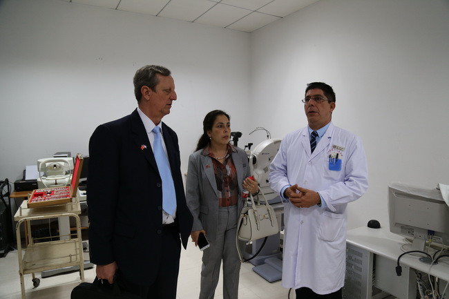 張兵院長對拉莫斯大使一行的到訪表示歡迎。并介紹了醫(yī)院發(fā)展概況、古巴專家在院工作及生活狀況。他說,醫(yī)院重視與古巴醫(yī)療的學(xué)習(xí)與合作,曾外派專家赴古巴哈瓦那大學(xué)專門學(xué)習(xí)語言以促雙方在更高領(lǐng)域及更深層次上的合作,探索在眼科基礎(chǔ)上增加其他專科合作的可能。張院長表示古巴方面可以將醫(yī)療新技術(shù)如“肺癌治療性疫苗”編制成文本供在院醫(yī)療專家學(xué)習(xí)與研究。雙方可以探索國人去古巴就醫(yī)轉(zhuǎn)診的機(jī)制與渠道。