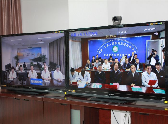 恰逢安徽省省長(zhǎng)李國(guó)英、省委副書(shū)記信長(zhǎng)星、省衛(wèi)計(jì)委主任于德志等一行赴山南市人民醫(yī)院為其“三級(jí)甲等”綜合醫(yī)院揭牌。揭牌儀式完成后,李國(guó)英來(lái)到山南市人民醫(yī)院遠(yuǎn)程會(huì)診中心,現(xiàn)場(chǎng)參觀了正在進(jìn)行的遠(yuǎn)程會(huì)診,并詢(xún)問(wèn)了患者病情和會(huì)診結(jié)果。