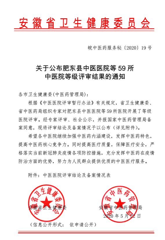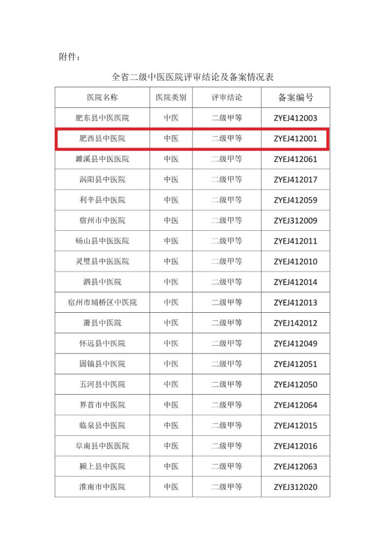 日前,安徽省衛(wèi)健委公布了中醫(yī)院等級評審結(jié)果,這是繼2012年通過二級甲等中醫(yī)醫(yī)院復(fù)審后,肥西縣中醫(yī)院再次順利獲評“二甲”。