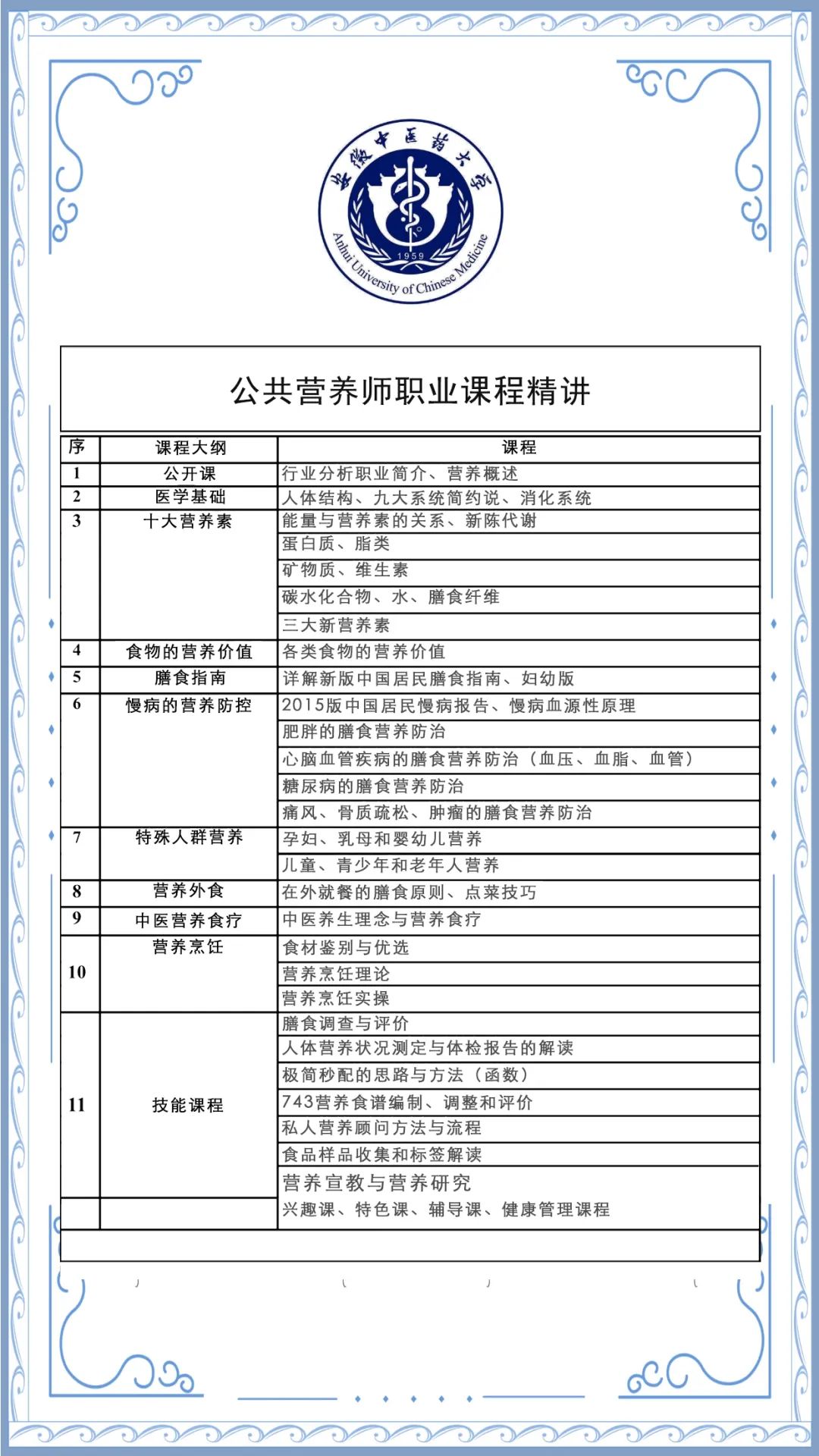 公共營(yíng)養(yǎng)師課程內(nèi)容涵蓋基礎(chǔ)營(yíng)養(yǎng)、食物營(yíng)養(yǎng)與食品衛(wèi)生、人群營(yíng)養(yǎng)、公共營(yíng)養(yǎng)、營(yíng)養(yǎng)缺乏與營(yíng)養(yǎng)過(guò)剩、營(yíng)養(yǎng)與疾病、營(yíng)養(yǎng)強(qiáng)化與保健食品、食品加工與烹飪及中醫(yī)藥膳與食療等內(nèi)容及營(yíng)養(yǎng)師必須具備的知識(shí)和技能。